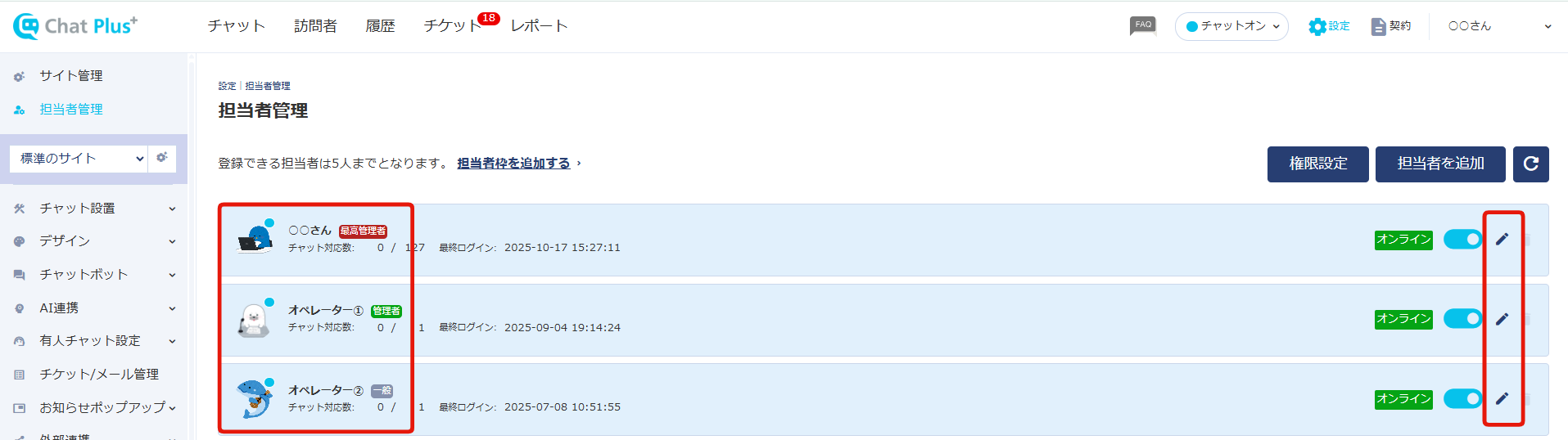 担当者管理( https://app.chatplus.jp/admin/cp/user-list )から、アカウントごとの権限を確認できます。