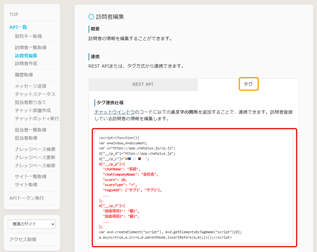 外部連携>API入力>訪問者編集>タグから、訪問者属性の記述例をご確認いただけます。