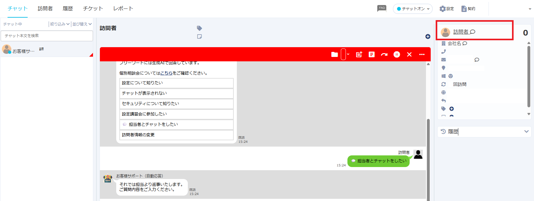 フォームで入力された情報は、チャット画面の訪問者情報に反映されます。