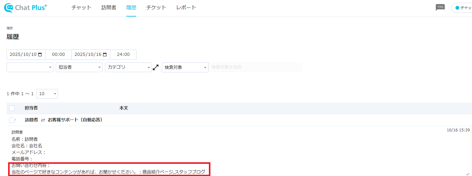 チャット開始前のフォームで取得した情報は、履歴ページでも確認できます。