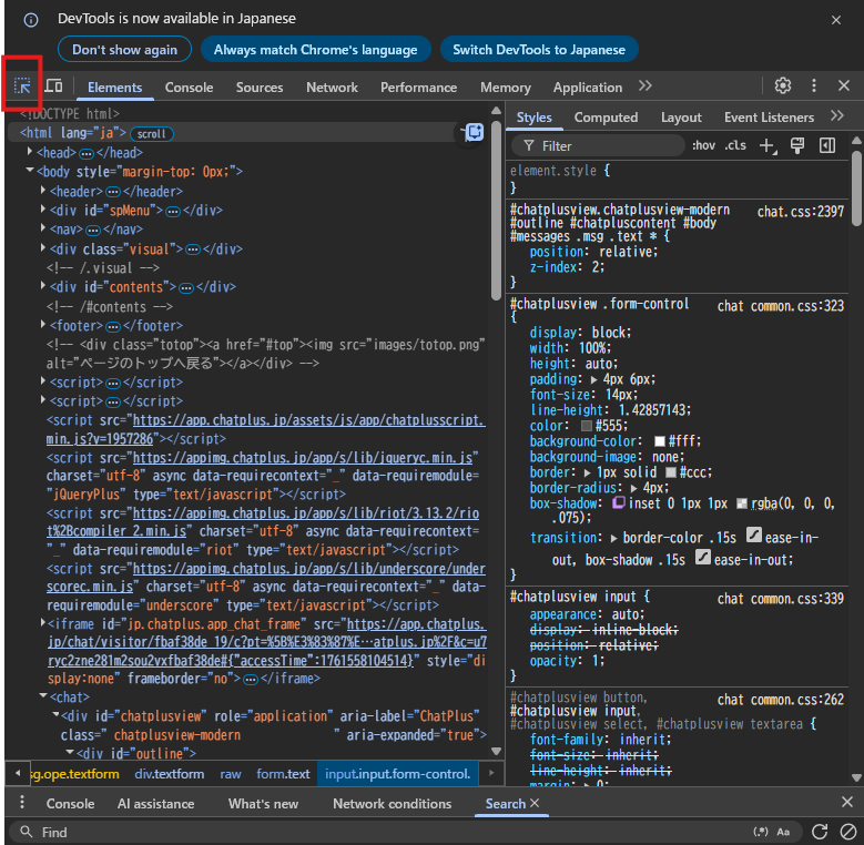 (2) デベロッパーツールの左上にある選択モードボタンをクリックします。
