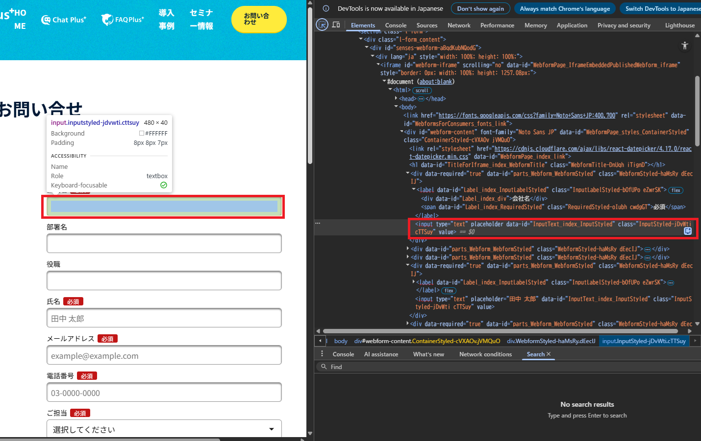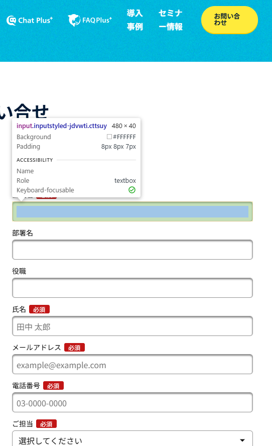 「form要素のID」や「name属性」は、デベロッパーツールを使用して確認できます。 フォームが設置されているページを表示した状態で、Windowsでは「F12」、Macでは「Command + Option + i」を入力してデベロッパーツールを使用できます。