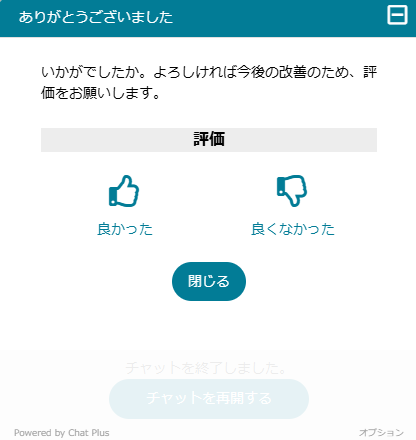 ※チャット終了後に、訪問者が再度チャットを立ち上げると「チャットを再開する」と表示されます。