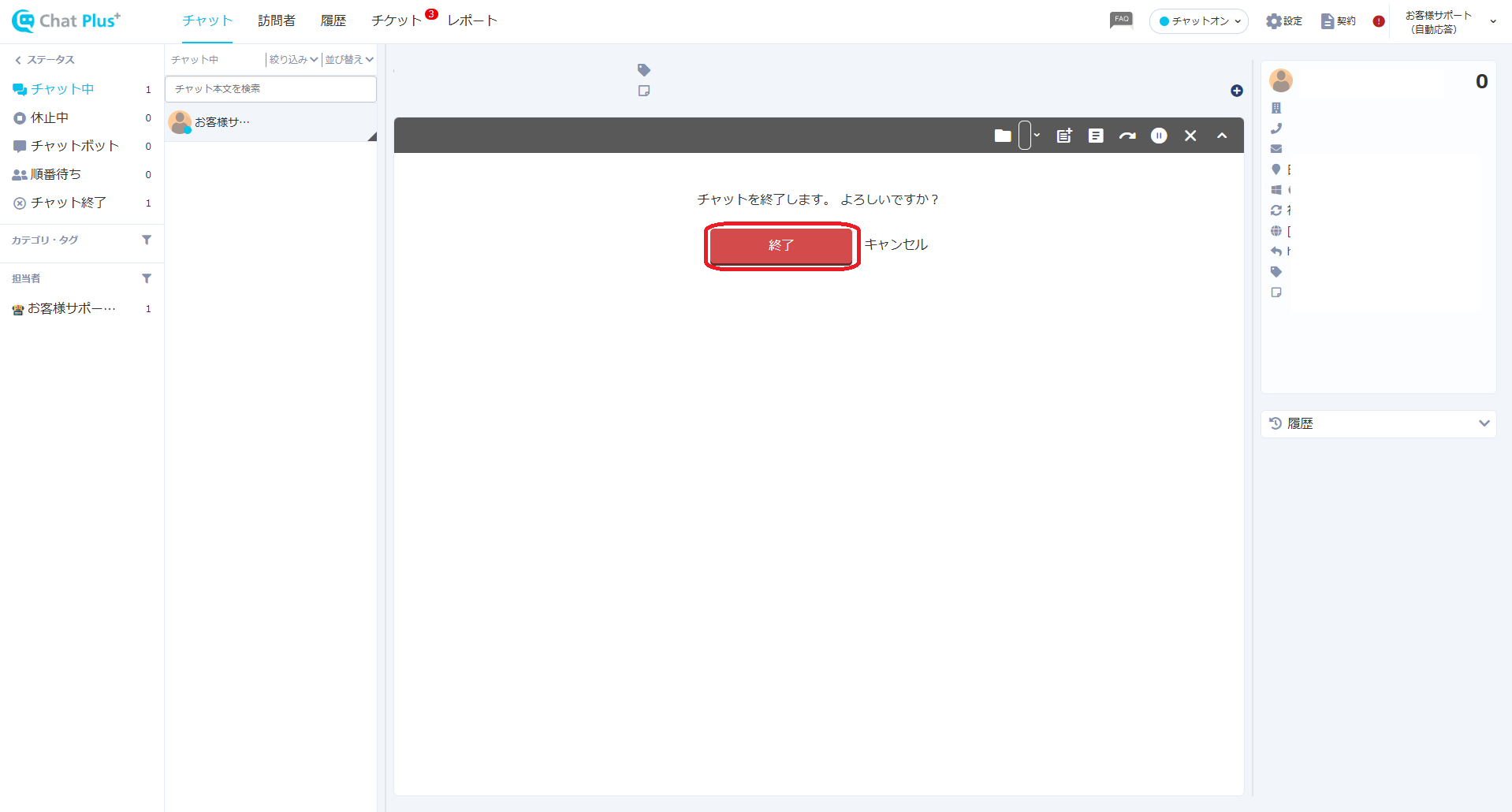 チャット中に担当者が「チャット終了」ボタンをクリックしてチャットを終了させると、ステータスが「チャット終了」になります。