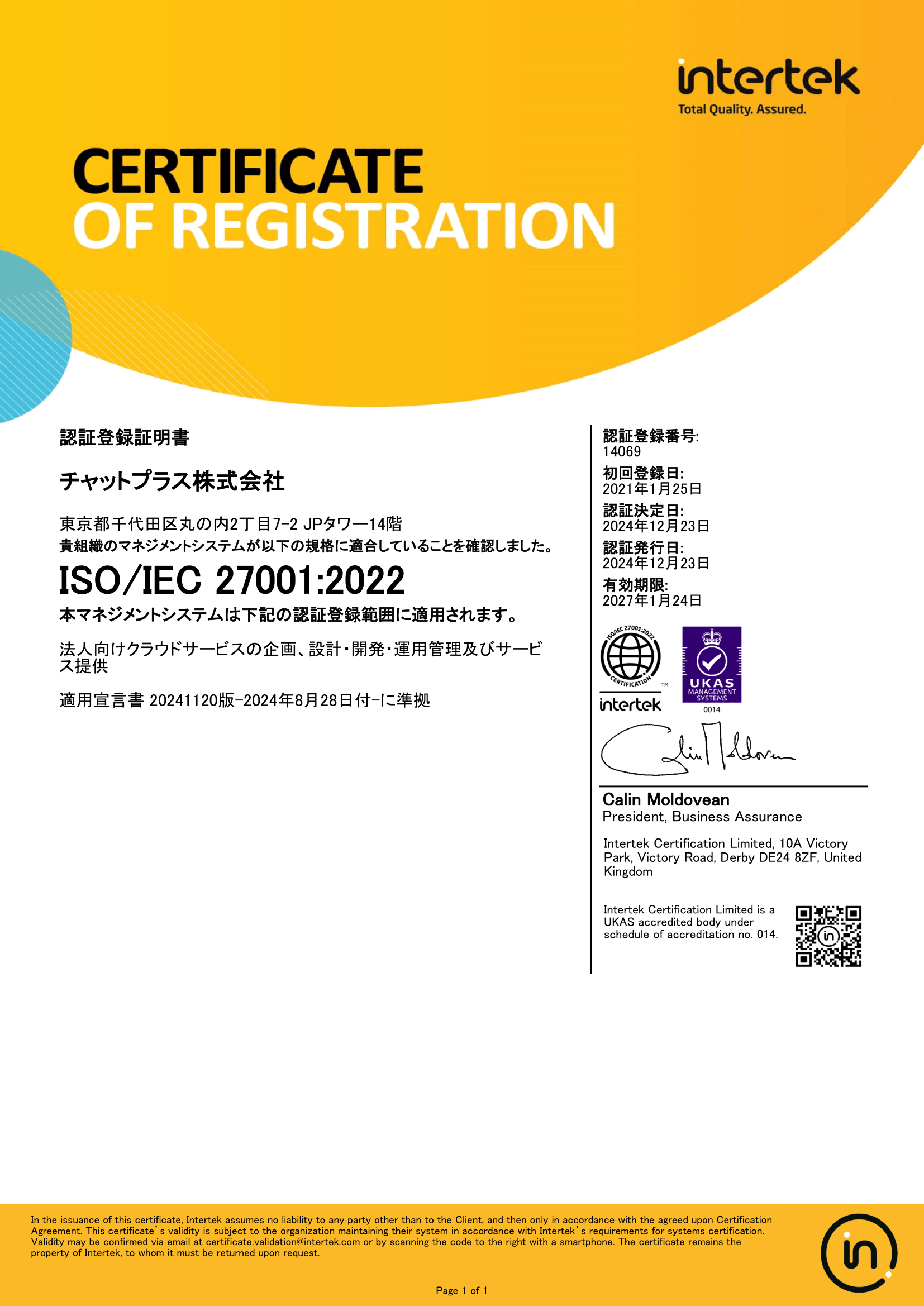 チャットプラス株式会社では以下の通り、ISMS認証(ISO27001)を取得しております。