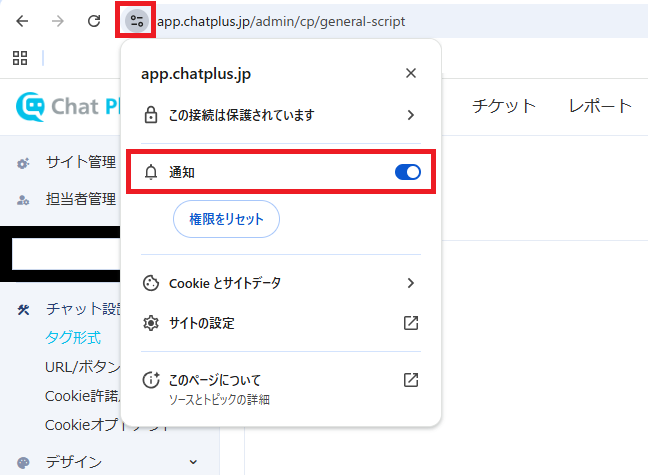 ONにした後、ChatPlusの管理画面から「ブラウザ通知を再登録」し、ブラウザ上部に「許可」「拒否」のボタンが表示されるか確認して下さい。