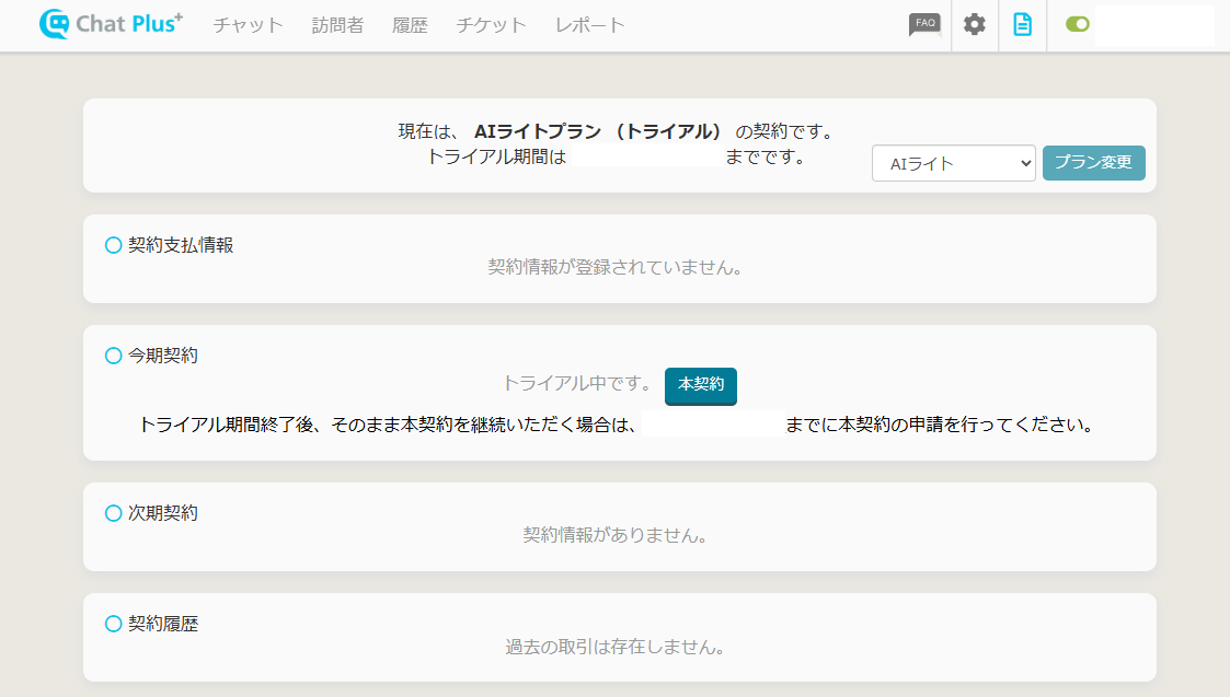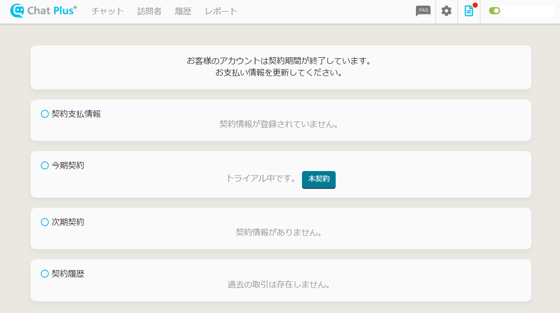 (1) 管理画面右上の「契約」ボタンをクリックします。