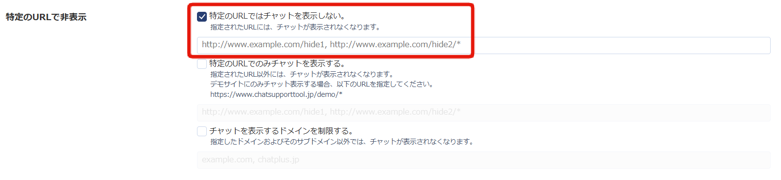(3)「特定のURLではチャットを表示しない。」にチェックをいれ、チャットを表示したくないページのURLを入力します。